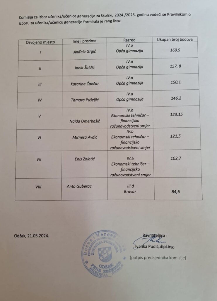 Komisija za izbor učenika/učenice generacije vodeći se Pravilnikom o izboru učenika/učenice generacije, za školsku 2024./2025. godinu objavljuje sljedeću rang listu: