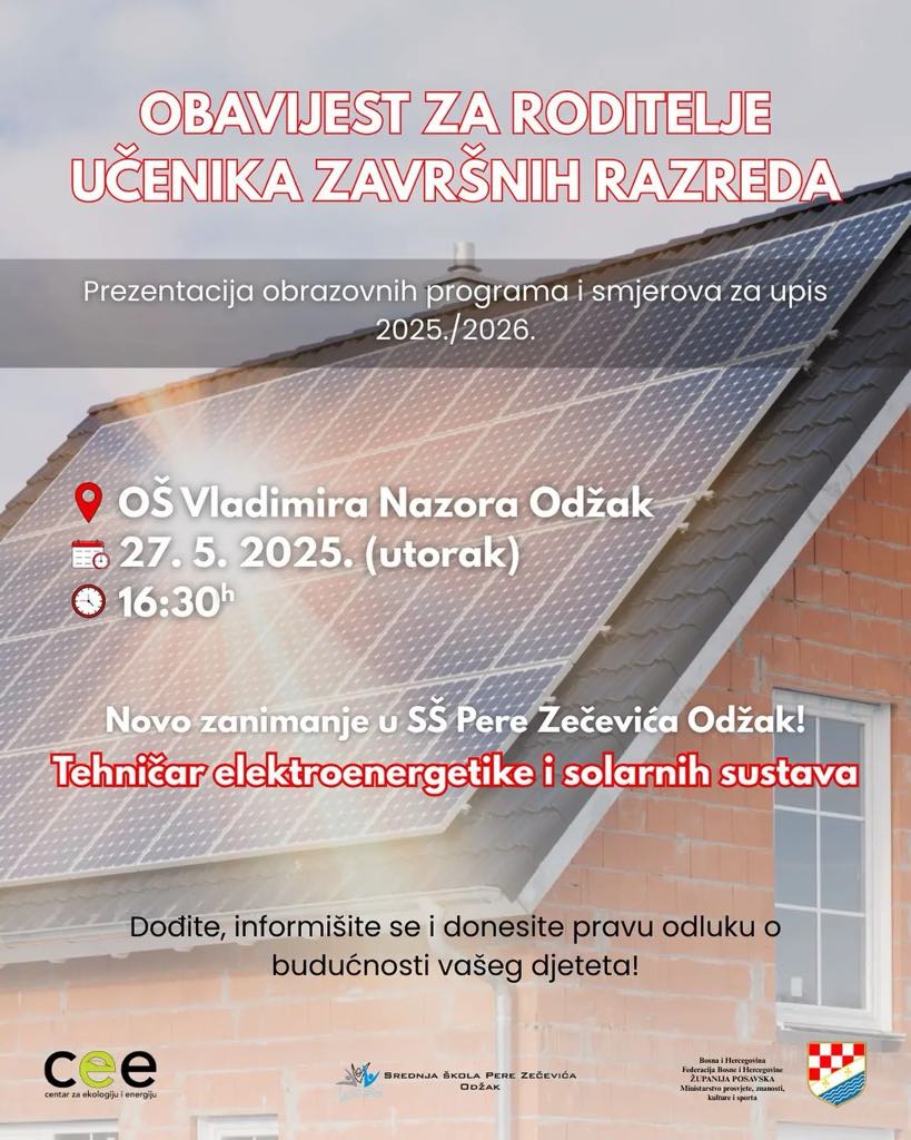 Posebno ističemo novi obrazovni program „Tehničar elektroenergetike i solarnih sustava“, koji se po prvi put uvodi u Bosni i Hercegovini i to upravo u Odžaku. Riječ je o inovativnom smjeru fokusiranom na obnovljive izvore energije i zelenu tranziciju, osmišljenom prema modularnom nastavnom planu s naglaskom na praktične vještine i pripremu učenika za moderno tržište rada.